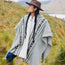These ponchos are 100% wool. Measurements are as follows: 43 inches in width and 35 inches in length (including the fringes). They are one size fits most.